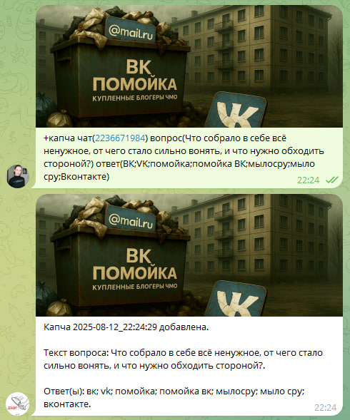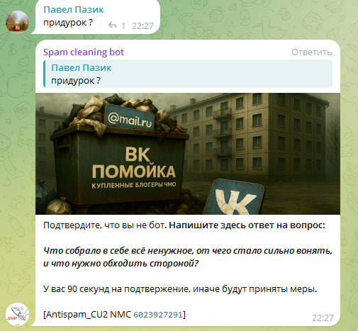 5. Понимая, что спамеры могут спамить абсолютно разными предложениями, была добавлена капча для новых комментаторов канала. Причём добавлено два вида капчи: 1й - базовый, нужно нажать кнопку что "не бот", его к слову не умеют проходить почти все разные спамерские ботофермы за исключением ботофорерм криптовалютчиков-трейдеров. В результате этого на "будущее" добавил второй вид капчи - пользовательский. Админы канала могут через бота задать любой вопрос, (и даже приложить картинку или видео к нему) и несколько вариантов ответа, которые обязан написать пользователь в новом сообщении. Вопросы можно задавать по тематике своих каналов (желательно достаточно простые, чтобы рядовой человек мог решить). Данная капча является практически нерешаемой задачей для спамботоферм (не, конечно можно прикрутить гпт на попытки её решения ответа, но это очень накладно). Если пользователь не подтвердит через заданный в конфиге промежуток времени, что он бот. Он будет забанен, а все его последние сообщения - удалены.
